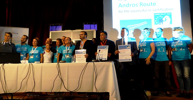 Μέσα σε χαρούμενο κλίμα ανανεώθηκε για δεύτερη φορά για μια ακόμα τριετία η ευρωπαϊκή πιστοποίηση στα μονοπάτια της Άνδρου. Η πρώτη πιστοποίηση είχε γίνει το 2015. Τιμητικά διπλώματα δόθηκαν στο εκπρόσωπο της Περιφέρειας Νοτίου Αιγαίου αντιπεριφερειάρχη Ναυτιλίας Γιάννη Μαργαρίτη, στον έπαρχο Άνδρου Δημήτρη Λοτσάρη και στον δήμαρχο Άνδρου Θεοδόση Σουσούδη, που είναι εταίροι στο πρόγραμμα των μονοπατιών που διαχειρίζεται το Andros Routes (φωτ. Εν Άνδρω).