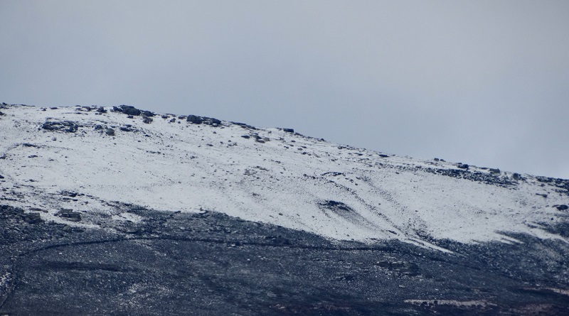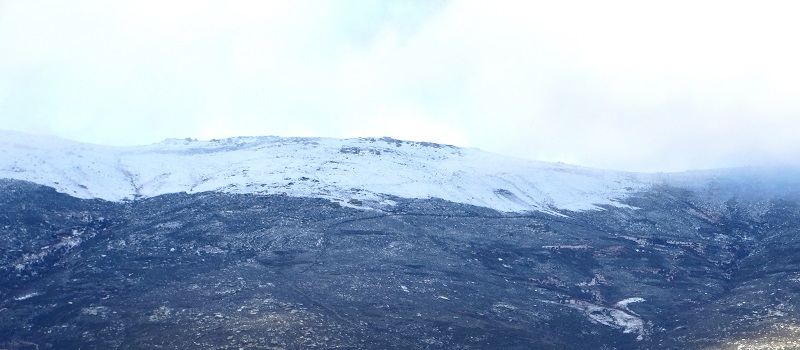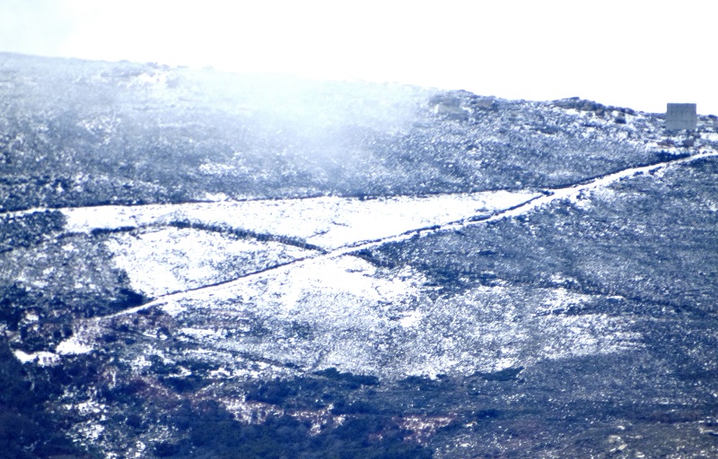 Φωτογραφία από τους Γερακώνες που φτάνουν στα 750 μέτρα. Σε αυτό το ύψος δεν χιόνισε. Όμως στην οροσειρά της Κουβάρας όπως βλέπουμε - από τα 750 μέχρι τα 999 μέτρα - έχει χιονίσει και παρά τον ήλιο το χιόνι κρατάει. Ηλίος με δόντια... (φωτ. Εν Άνδρω).