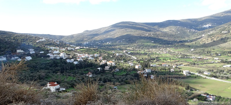 Και τα χωριά του Κορθίου να απλώνουν τριγύρω στον κάμπο και στις γύρω πλαγιές λαμπερά μετά την βροχή. Από εδώ δεν μπορείς να φανταστείς πως η Κουβάρα είναι χιονισμένη. Μόνο το διαπεραστικό κρύο υποψιάζει πως κάπου χιόνισε... (φωτ. Εν Άνδρω).
