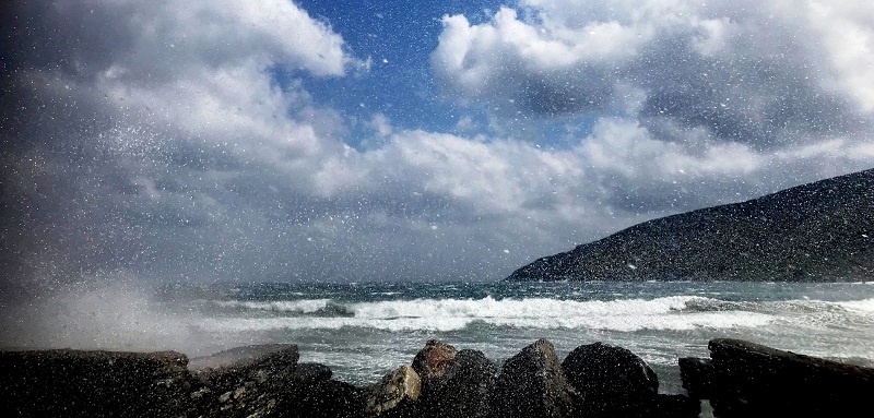 Κάποιες στιγμές εντυπωσιασμένος από την θαλασσοδαρμένη ακτή ανέβηκε στα βράχια και ένα μεγάλο κύμα έσκασε πάνω στα βράχια πιτσιλώντας αφρούς τα πάντα γύρω του. Η φωτογραφία αποτύπωσε τον αφρό πάνω από το αφρισμένο πέλαγος. Μια αίσθηση διαφορετική (φωτ. Χαρίδημος).