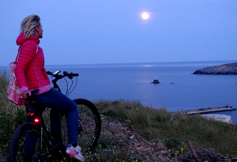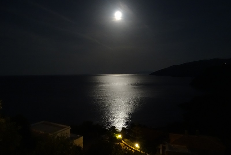 Η γερμανίδα από το μακρινό Αμβούργο ανέβαινε προς την Αγία Τριάδα όταν είδε την πανσέληνο του Μάη. Στάθηκε κι έμεινε για λίγο να ταξιδεύει με το φεγγάρι. Κάτω ο υπέροχος Τουρλίτης κι ένα πέλαγος "ρόδο αμάραντο" που είπε ο ποιητής (φωτ. Εν Άνδρω)