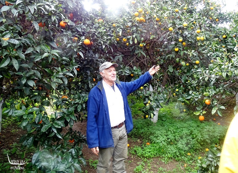 Ο Αντώνης Λιοπύρος χαμογελαστός ανάμεσα στις πορτοκαλιές και στις λεμονιές του...