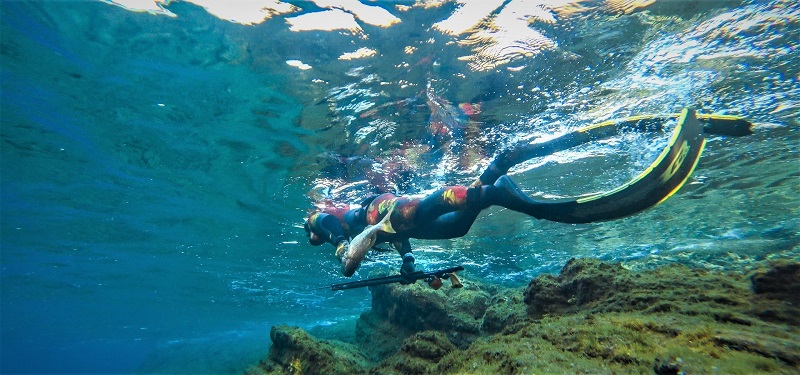 Από εκεί ανάμεσα στα σύννεφα και στον λίγο χρόνο που έμενε πριν δύσει ο ήλιος, φύγαμε για να συνεχίσουμε το γύρισμα του ντοκιμαντέρ κάτω από την επιφάνεια της θάλασσας. Στην βορειοδυτική πλευρά της Άνδρου πλέον. Βούτηξα επιτέλους στα πεντακάθαρα, κρυστάλλινα νερά του νησιού μας. Εκεί οι υποβρύχιες κάμερες πλέον, ανέλαβαν τα αποτυπώσουν την ομορφιά του υποβρύχιου κόσμου, σε μια βουτιά για ψαροντούφεκο, εξασκώντας την πιο οικολογική και βιώσιμη μορφή αλιείας.