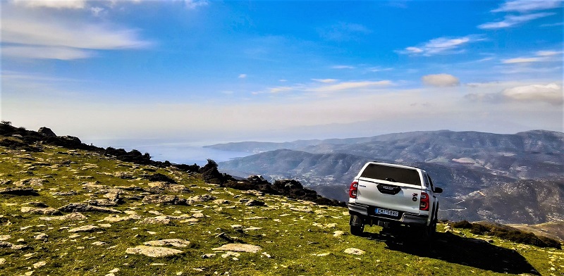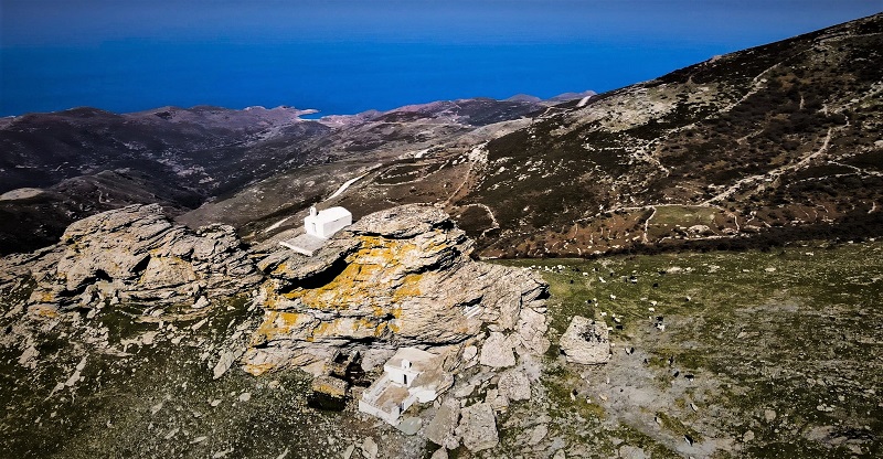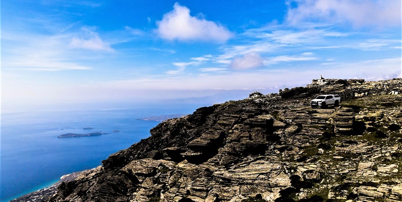 Μετά από 6χλμ σχετικά βατού χωματόδρομου, βρίσκεσαι στην 3η υψηλότερη κορυφή του Αιγαίου, απ’ όπου μπορείς να θαυμάσεις νησιά, που βρίσκονται ακόμα και 50μίλια μακριά! Μπορείς επίσης να δεις σχεδόν όλο το νησί της Άνδρου προς τον Καμπανό βόρεια και μέχρι το Στενό και την Τήνο. Και το εντυπωσιακό ξωκλήσι του Προφήτη Ηλία, χτισμένο επάνω στο άγριο σύμπλεγμα βράχων, πάνω από την Άρνη.