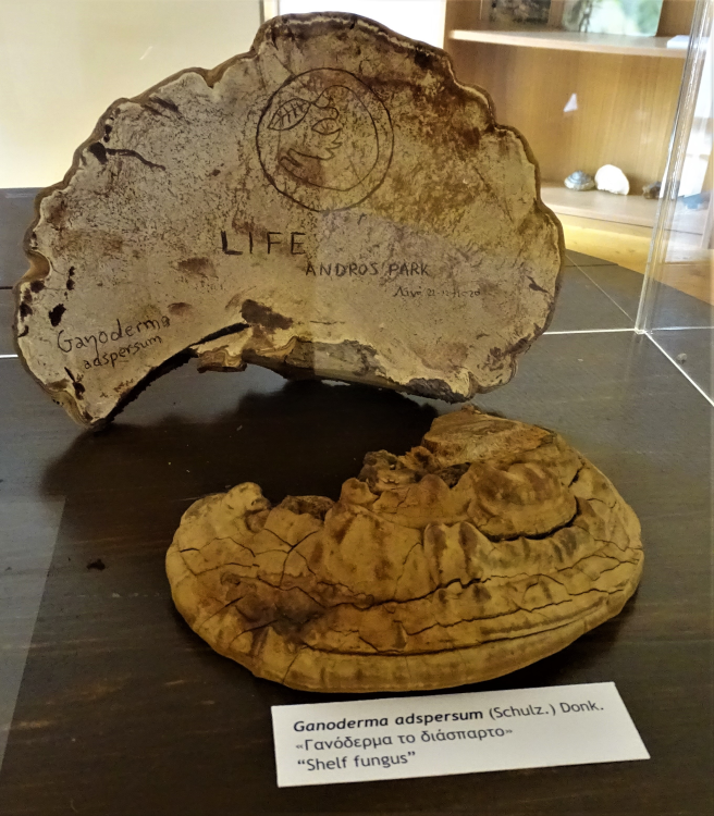 ΜΟΥΣΕΙΟ & ΦΥΣΙΚΗ ΙΣΤΟΡΙΑ: Στο πλαίσιο των δράσεων του έργου LIFE Andros Park, σε συνδυασμό με τη δημιουργία του Βοτανικού Κήπου, σχεδιάστηκε και υλοποιήθηκε από τη μυκητολογική ομάδα του Γεωπονικού Πανεπιστημίου Αθηνών μια μόνιμη εγκατάσταση με εκθέματα από μανιτάρια. Για τον σκοπό αυτό, δείγματα ζωντανών μανιταριών που βρέθηκαν πάνω σε κορμούς και ξύλα, κυρίως σκλήθρου αλλά και άλλων δέντρων, συλλέχθηκαν από διάφορες περιοχές της Άνδρου, όπως η Βόρη, η Άρνη, τα Αποίκια, οι Κατακαλαίοι κ.α. και μεταφέρθηκαν στο Κτήμα Αγαδάκη. Στο εγχείρημα αυτό συνέβαλαν τα μέγιστα οι του Γεωπονικού Πανεπιστημίου Ηλίας Πολέμης, Γεώργιος Ζερβάκης, Βασίλειος Δασκαλόπουλος και Γεώργιος Κουτρώτσιος, ενώ καθοριστική ήταν και η συμμετοχή του κηπουρού του Βοτανικού Κήπου Παναγιώτη Λουκαδή. Επιπλέον, συνεχής και πολύτιμη είναι η συνδρομή-συμπαράσταση της Διευθύντριας της Καϊρείου Βιβλιοθήκης κας Ειρήνης Δάμπαση.