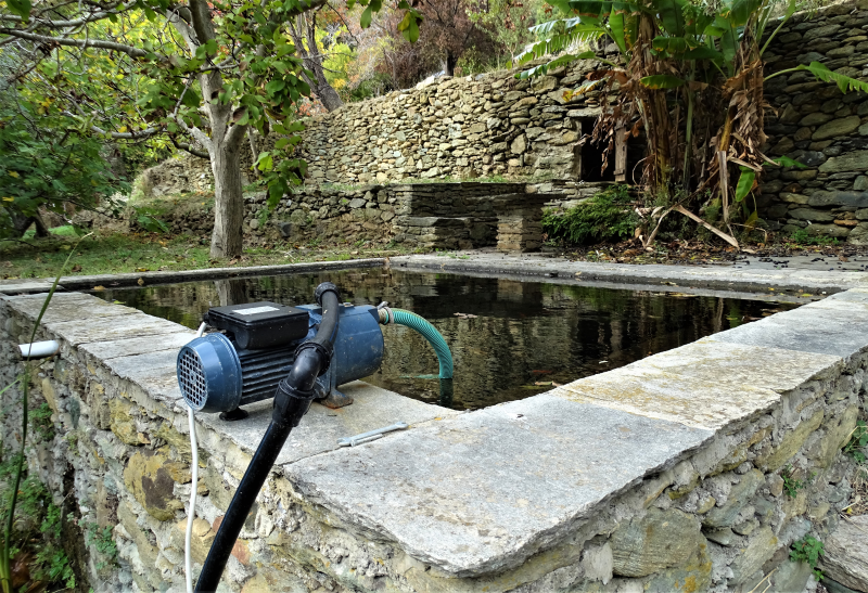 Το περιβόλι, με τις δύο ιδιόκτητες πηγές του πέρα από το συνηθισμένο αρδευτικό του νερό αποκτά την εικόνα του πατροπαράδοτου ανδριώτικου κτήματος με "ποτιστικό" χωράφι. Η στέρνα ή και χαβούζα κατά την παλαιά ανδριώτικη διάλεκτο ήταν αυτή στην οποία μάζευαν το νερό της πηγής και από αυτήν πότιζαν το κτήμα. Σήμερα με το πιεστικό μηχάνημα ποτίζετε όλο το κτήμα. Και αυτό δηλαδή που ήταν στο πάνω μέρος της πηγής και της στέρνας που είχε οπωροφόρα δέντρα και σήμερα αποτελεί μέρος του βοτανικού κήπου.