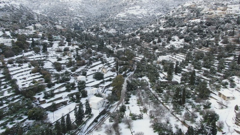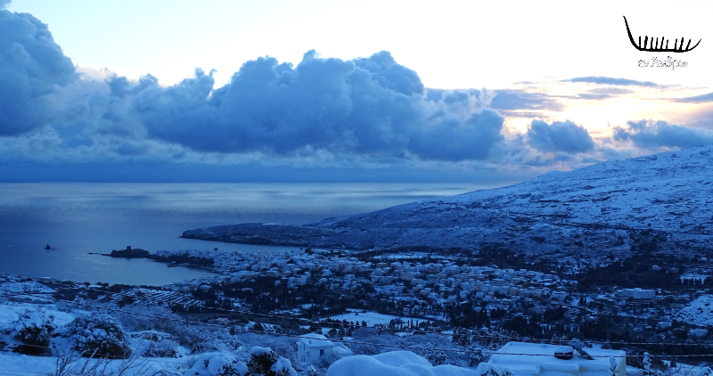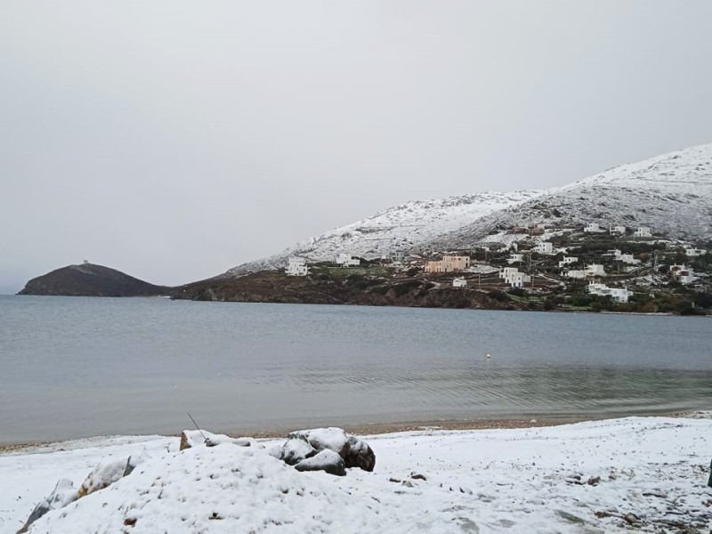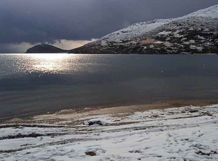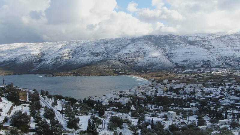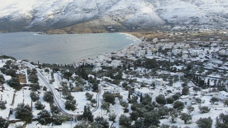Γαύριο χιονισμένο μέχρι την θάλασσα. Κυριακή 23 Ιανουαρίου 2022. Ρεπορτάζ Μαρία Στεφανία.