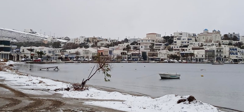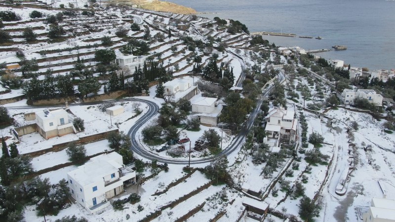Χιόνια μέχρι τα σπίτια του Χάρακα στο Γαύριο. Χιόνια μέχρι τη θάλασσα απέναντι και στο λιμάνι. Κυριακή 23 Ιανουαρίου 2022. Ρεπορτάζ Μαρία Στεφανία.