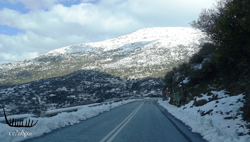 Η χιονισμένη Κουβάρα πάνω από την Παλαιόπολη. Ο κεντρικός δρόμος της Άνδρου καθαρός χωρίς χιόνια. Έκαναν καλή δουλειά όλες τις μέρες και δεν έκλεισε ποτέ. Βοήθησαν και οι αλατιέρες που ήρθαν και δεν έπιασε πάγο. Τοπίο βγαλμένο από κάποιο βόρειο ευρωπαϊκό κράτος...