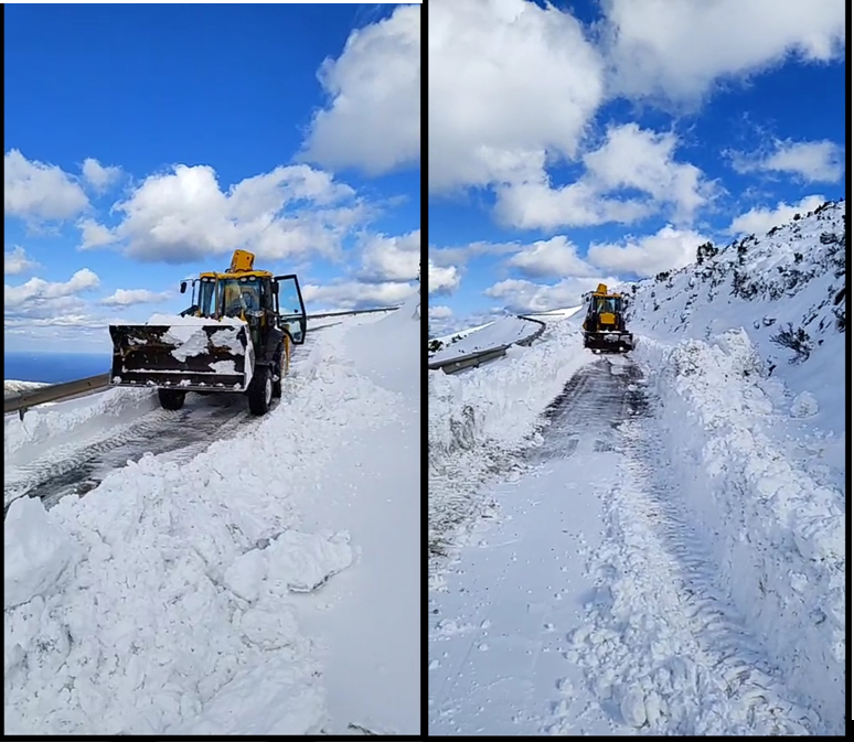 Μετά διανοίγει τον δρόμο. Δηλαδή διανοίγει 2,5, άντε 3 μέτρα μέσα στο χιόνι που καλύπτει για 4η μέρα. Από Σάββατο βράδυ ξεκίνησε να γεμίζει χιόνι μέχρι Τετάρτη απομεσήμερο που έφτασε πάλι μέχρι εκεί ανοίγοντας έναν δρόμο που έκλεινε τη νύχτα. Δύο φορές έφτασαν και πέρασαν την διασταύρωση προς Κατακαλαίους κι άλλες τόσες το χιόνι της νύχτας τους γύρισε πίσω στ' Αποίκια.
