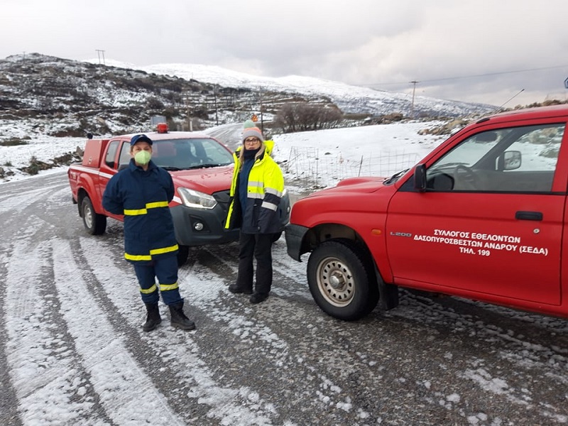 Οι δύο κυρίες σε επιφυλακή. Ώρα 7:39 στη Στραυροπέδα η υποδιοικητής του κλιμακίου της πυροσβεστικής Άνδρου και η υπεύθυνη Πολιτικής Προστασίας του Δήμου Άνδρου μετά την πολύ πρωινή περιπολία όπου ήλεγξαν τους παγωμένους δρόμους συναντήθηκαν στο ορόσημο της Σταυροπέδας. Μια φωτογραφία μπροστά στα οχήμτα που οδηγούσαν οι ίδιες. Για να ξέρουμε πως έχουμε φύλακες άγρυπνους μέσα στο χιονιά τις δύο κυρίες που αξίζουν όσο (ή και περισσότερο) από πολλούς άνδρες...