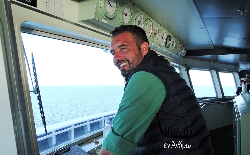 Ακολούθως βλέπεις τον καπετάν Θανάση σε αυτό ανεπίσημο ταξίδι με τα πολιτικά. Χαλαρός και γελαστός. Δεν έχει επιβάτες πέρα από καμιά 15αριά οικείους που ανεβήκαν στην Χώρα για να πάνε μίνι κρουαζιέρα μέχρι το Γαύριο...