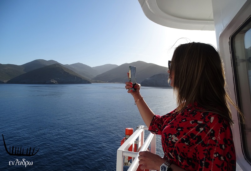 Και στο τέλος δεν βλέπεις τα Άχλα. Ο εκτυφλωτικός ήλιος του απογεύματος - όπως πέφτει υπό γωνία - είναι σχεδόν απαγορευτικός για να δεις την υπέροχη παραλία της Άνδρου. Το μόνο που διασώζεται μέσα στον εκθαμβωτικό ήλιο του απογεύματος είναι η Βάσια που επιχειρεί να φωτογραφίσει κάτι από το πανόραμα της Άνδρου...