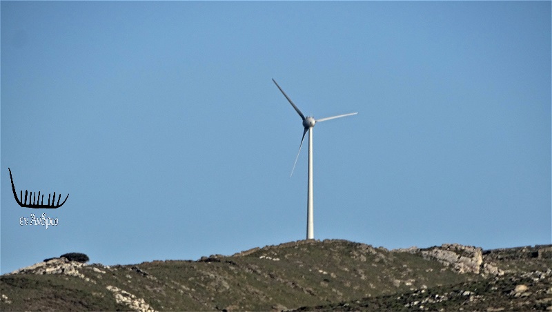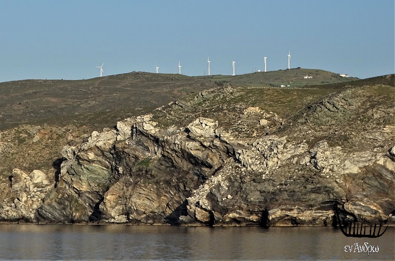 Πιο πίσω από το ακρωτήρι εκεί που ψηλώνει το τοπίο, πάνω στα βράχια και τους άνυδρους λόφους, σαν κουκίδες οι τρεις πρώτες ανεμογεννήτριες. Μπήκαν πριν δ'υο χρόνια περίπου. Και αυτή η φωτογραφία με τηλεφακό. Γιατί χωρίς τηλεφακό οι ανεμογεννήτριες που "τρόμαζαν" κάποιους δεν φαίνονται σχεδόν καθόλου. Πάνω από τα 300 και πλέον μέτρα των βράχων οι τρεις ανεμογεννήτριες στα 54 μέτρα υψόμετρο ο πυλώνας κάθε μιας τους...