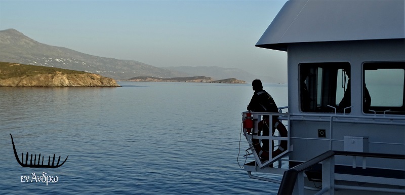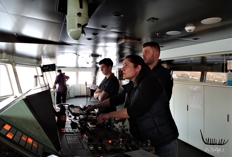 Η υποπλοίαρχος Ειρήνη κάνει τους αναγκαίους χειρισμούς για να μπει το πλοίο στο λιμάνι υπό τις εντολές του καπετάν Θανάση. Η όλη διαδρομή - όπως μας εξήγησε η υποπλοίαρχος Ειρήνη - από την Χώρα στο Γαύριο διάρκεσε γύρω στη μια ώρα και τριάντα λεπτά. Άλλο τόσο περίπου διάρκεσε και η πλεύση του πλοίου από την Μύκονο στη Χώρα της Άνδρου. Είναι μεγάλο πράγματι το νησί μας. Και ο περίπλους του θέλει ώρες.