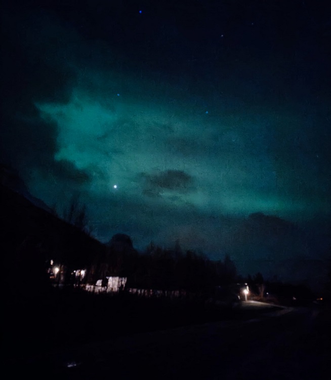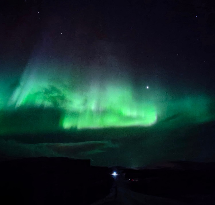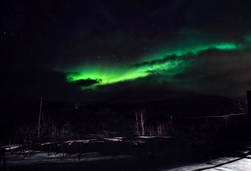 Χιονισμένο τοπίο τριγύρω. Και πάνω από τον ουρανό οι εκρηκτικές πράσινες ακτίνες κι ανταύγειες του Βορείου Σέλατος σαν μια κοσμική έκρηξη που συνεπαίρνει όσους έφτασαν μέχρι εκεί για να το ζήσουν...