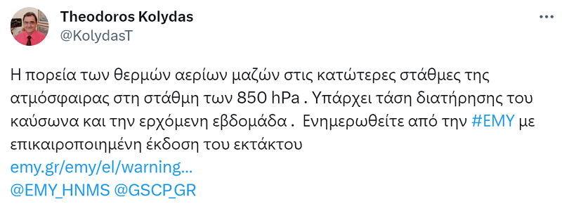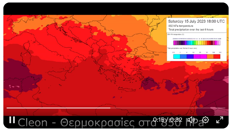 Το εκτεταμένο πεδίο υψηλών πιέσεων που καλύπτει τις ακτές της Αφρικής και τη Δυτική και Κεντρική Μεσόγειο και συνοδεύεται από πολύ θερμές αέριες μάζες επεκτείνεται σταδιακά ανατολικότερα και προκαλεί συνθήκες καύσωνα από την Τετάρτη (12-7-2023) έως και τις αρχές της επόμενης εβδομάδας. Ο καύσωνας αυτός λαμβάνει την ονομασία 'CLEON' και εντάσσεται στα Επικίνδυνα Καιρικά Φαινόμενα με διάρκεια τουλάχιστον έξι ημερών με θερμότερες ημέρες την Παρασκευή (14-7-2023) και το Σάββατο (15-7-2023).