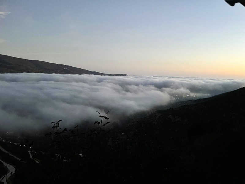 σου αποστέλλω δύο ξεχωριστές φωτογραφίες που τράβηξα κατεβαίνοντας αξημέρωτα από τους Γερακώνες στη Χώρα. Δύο μοναδικές στιγμές όπου το σύννεφο της φθινοπωρινής υγρασίας επικάθεται πάνω από την κοιλάδα της Χώρας στα 380-400 περίπου μέτρα. Κι αυτό με δεδομένο πως η Μονή Παναχράντου είναι στα 500 μέτρα.
