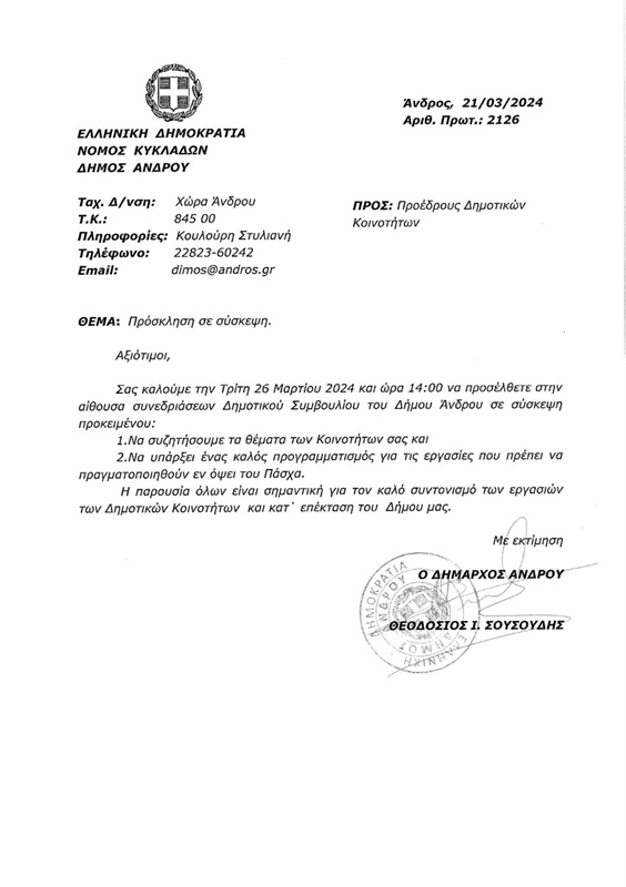 Διαμαρτυρήθηκε δημοσίως ο τοπικός σύμβουλος Ν. Κατσίκης στις 21/3 και στηρίξαμε στη διαμαρτυρία του με το δημοσίευμα " ΣΤΑ ΑΚΡΑ: Το 50% αποκλείει κάθε συνεννόηση με το άλλο 50% του νησιού!!!...". Εδώ ο δήμαρχος ανέκρουσε πρύμνα αμέσως. Και εξέδωσε και πρόσκληση προς τους προέδρους όλων των δημοτικών κοινοτήτων (δικούς του και μη δικούς του) καλώντας τους την Τρίτη 26 Μαρτίου στο δημαρχείο να δουν από κοινού τα προβλήματα των περιοχών του νησιού ενόψει Πάσχα. Ο δήμαρχος αναγκάστηκε και μετέβαλλε στάση εμμέσως πλην σαφώς. Περιμένουμε λοιπόν το Πάσχα από την μεριά του να δούμε... τι θα δούμε!...