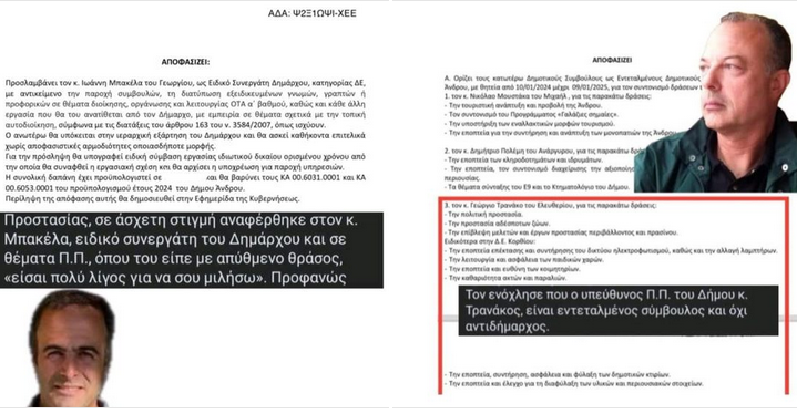 (Φωτογραφική αποτύπωση των αρμοδιοτήτων των δύο στελεχών του Δήμου. Σε μαύρο φόντο χθεσινές παρατηρήσεις του δημάρχου από τον μακροσκελή και ασυνάρτητο χθεσινό σχολιασμό του περί των αρμοδιοτήτων τους. Ο κ. Σουσούδης μοιάζει χαμένος στο διάστημα και οι συνεχείς αλλοπρόσαλλοι διορισμοί ή ορισμοί του απλώς αποδεικνύουν την πλήρη σύγχυση του στη διοίκηση. Κοντεύουμε μέσα Ιουλίου και κανείς - ούτε ο ίδιος ο δήμαρχος - δεν ξέρει, όπως σημειώνει παρακάτω σε σχόλιο του ο κ. Κ. Θωμάς, ποιος είναι κατά νόμο και κατά ουσία ο υπεύθυνος Πολιτικής Προστασίας της Άνδρου. Κατά τα άλλα συνεχίζει να διοικεί αμέριμνος "με βάρκα την ελπίδα"... ΕΝ ΑΝΔΡΩ)
