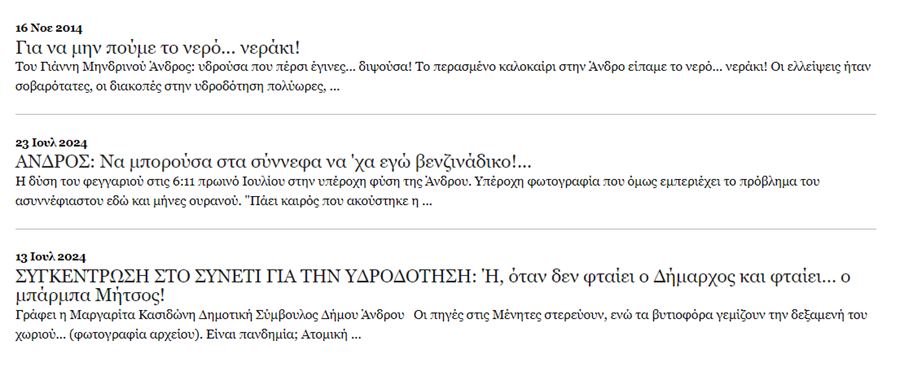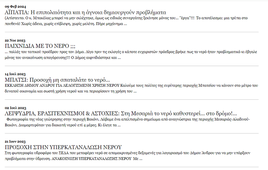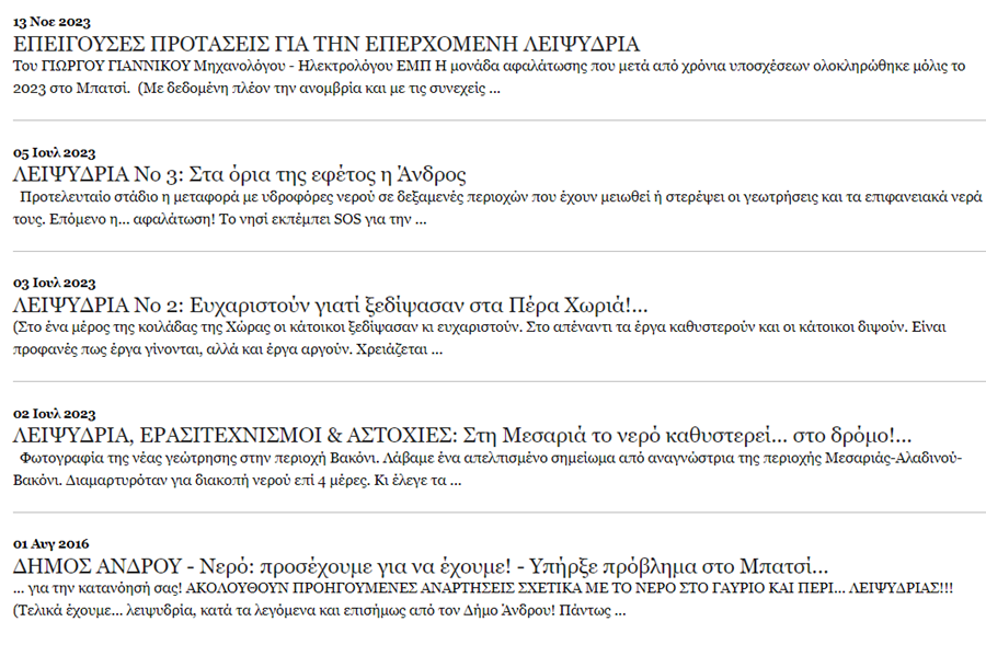 Ακολουθούν σειρά δημοσιευμάτων του Εν Άνδρω τα οποία διάβασαν δεκάδες χιλιάδες αναγνώστες αλλά όχι οι αρμόδιοι. Γι' αυτό και πιάστηκαν στον ύπνο παντού εφέτος. Και στο τέλος έκλεισαν τις οι ντουζιέρες!!! Θα παρακαλέσουμε τους αναγνώστες να σταθούν στα άρθρα που έχουν δημοσιευτεί το 2023 και το 2024.