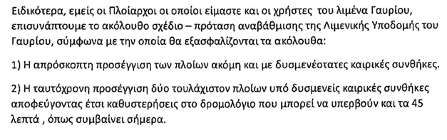 "Η καθημερινή προσέγγιση στον λιμένα του Γαυρίου κρίνεται ιδιαίτερα δύσκολη και οι προσδέσεις μας στο λιμένα οφείλονται αποκλειστικά στις μεγάλες προσπάθειες που καταβάλουμε εμείς και τo πλήρωμα μας. Καθημερινά καλούμαστε να αντιμετωπίσουμε τις καιρικές συνθήκες σε συνδυασμό με τις υπάρχουσες λιμενικές υποδομές...".
