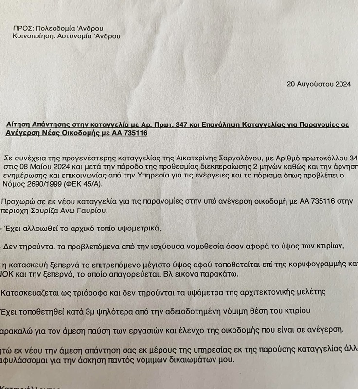 'Εκαναν νέα καταγγελία στην πολεοδομία Άνδρου στις 20/8. Ήδη έχουν περάσει 20 μέρες και ο προϊστάμενος της τεχνικής υπηρεσίας του Δήμου Άνδρου - που έχει το θέμα στα χέρια του - δεν απαντά! Ενδιαμέσως οι περίοικοι επισκέφθηκαν και τον δήμαρχο Σουσούδη - που είναι ο πολιτικός προϊστάμενος της πολεοδομίας - κι άκρη δεν έβγαλαν. Έτσι, χωρίς καμία απάντηση η τριώροφος οικοδομή της επάρχου Άνδρου ξανάρχισε να κτίζεται.
