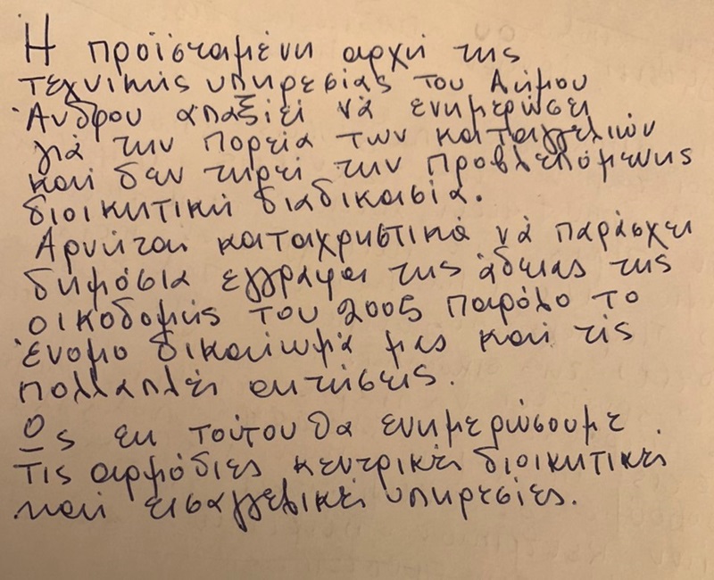 Εδώ και 3 μέρες έστειλαν την νέα καταγγελία τους στον ιστότοπο μας. Τους ζητήσαμε να γράψουν για τις απαντήσεις που ΔΕΝ έχουν λάβει από τον Δήμο Άνδρου. Και τι προτίθενται να κάνουν πλέον. Απάντησαν με σημείωμα που δημοσιεύουμε: την επόμενη εβδομάδα ο φάκελος των καταγγελιών τους θα παραδοθεί στην εισαγγελία και στον Συνήγορο του Πολίτη. Αυτό το τελευταίο επειδή η υπόθεση αφορά δημόσια υπηρεσία του Δήμου Άνδρου που κωλυσιεργεί! Και δημόσιο λειτουργό (την έπαρχο) που παρανομεί!