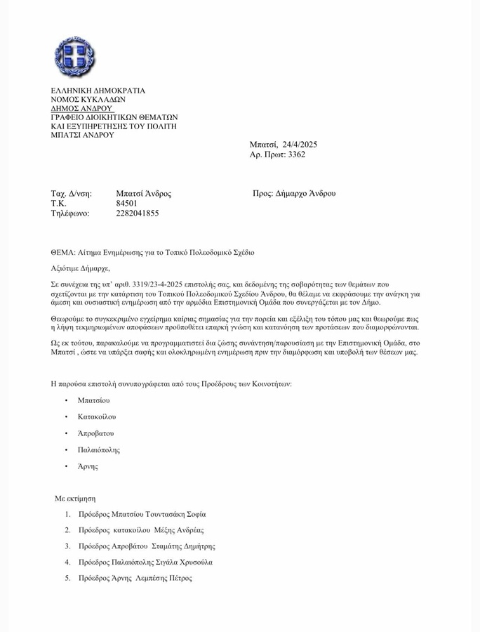 ΑΙΤΗΜΑ ΠΡΟΣ ΔΗΜΟΥ ΑΝΔΡΟΥ ΤΟΠΙΚΩΝ: ΜΠΑΤΣΙΟΥ, ΚΑΤΑΚΟΙΛΟΥ, ΑΠΡΟΒΑΤΟΥ, ΠΑΛΑΙΠΟΛΗΣ, ΑΡΝΗΣ