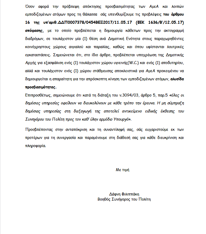 Συνημμένα θα βρείτε την Υπενθυμιστική επιστολή του Συνήγορου του Πολίτη για τις Αναφορές που έχω υποβάλει κατά του Δήμου Άνδρου για την πλημμελή παροχή διευκολύνσεων προς τους ΑμεΑ - τόσο για τις 2 καταγγελλόμενες περιπτώσεις των Μηχανισμών Υποβοήθησης στην κολύμβηση των ΑμεΑ (στην παραλία Αγίου Πέτρου το 2024 και σε αυτή του Όρμου Κορθίου το 2025) όσο και για το διαρκές και χρονίζον πρόβλημα της μη διάθεσης οχημάτων μεταφοράς των ΑμεΑ κατά μήκος των πεζοδρομημένων οδών (κύρια της Χώρας) ενώ θεωρητικά υπάρχει επάρκεια των δωρηθέντων ηλεκτροκίνητων οχημάτων.