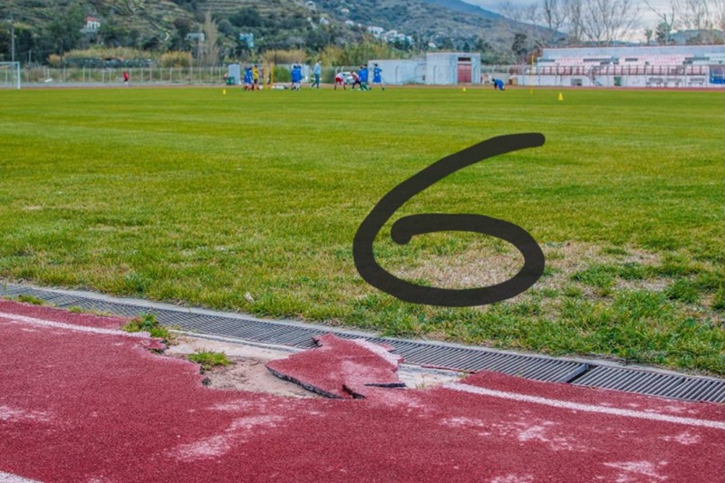 Ταρτάν διαλυμένο, χορτάρι ακατάλληλο, πυλώνες πεταμένοι στο έδαφος, καθίσματα ακατάλληλα να φιλοξενήσουν θεατές!