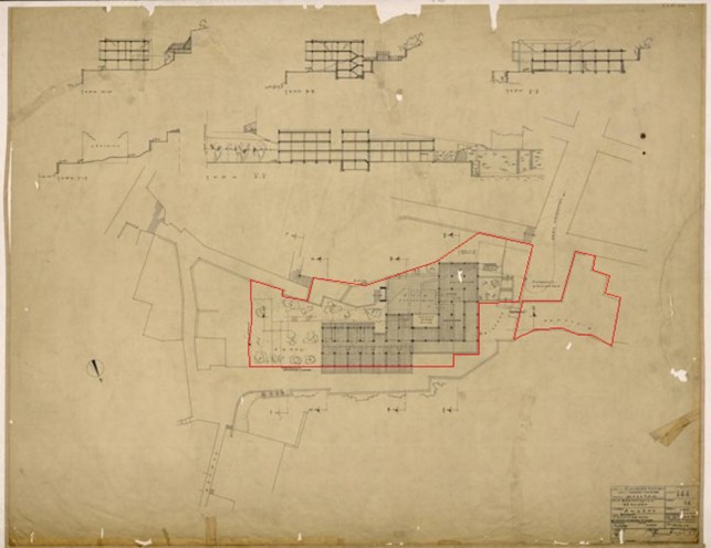 Το επίσημο Τοπογραφικό - Σχέδιο Γενικής Διάταξης στον φάκελο της έκδοσης Οικοδ. Άδειας (από το αρχείο του Άρη Κωνσταντινίδη) - με κόκκινη γραμμή το περίγραμμα της συνολικής εδαφικής ιδιοκτησίας.