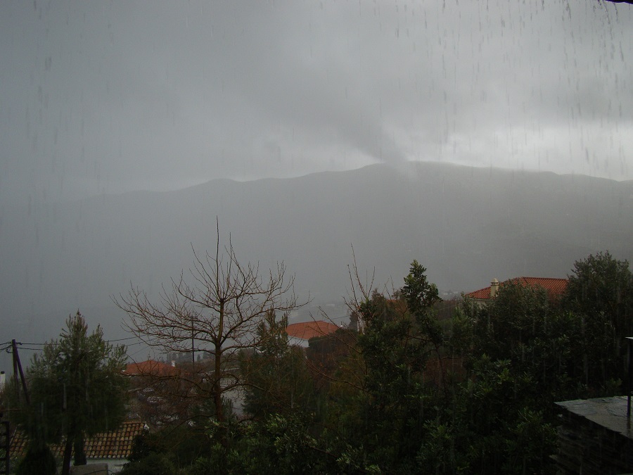 Μαζί με την ψήφο και η βροχή. Κατά διατήματα οι καταιγιστικές ριπές της βροχής "έσβηναν" από τον ορίζοντα ακόμα και τα βούνα. όπως εδώ που βλέπεται να αχνοδιαγράφονται μέσα από το πέπλο της βροχής οι Γερακώνες