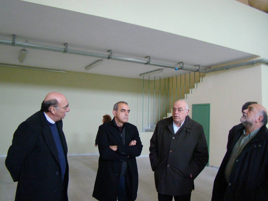 Ο Γ. Γλυνός εξηγεί στους δύο κυβερνητικούς βουλευτές (Α. Συρίγο και Ν. Συρμαλένιο) τα της ιστορίας του κτηρίου. Τις εξηγήσεις παρακολουθεί ο δημ. σύμβουλος της μειοψηφίας Γ. Καπάκης.