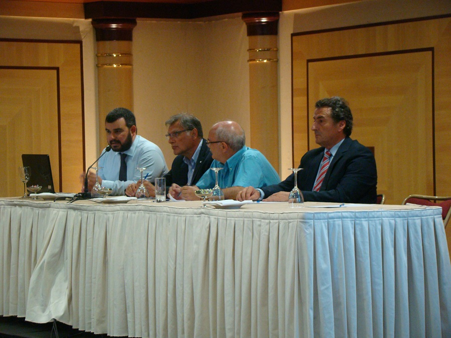 Οι δύο εισηγητές εξήγησαν τα της λειτουργίας ΧΥΤΑ και της ανακύκλωσης. Διακρίνονται στο πάνελ ο συντονιστής Γιάννης Μηνδρινός και ο δήμαρχος Θεοδόσης Σουσούδης.