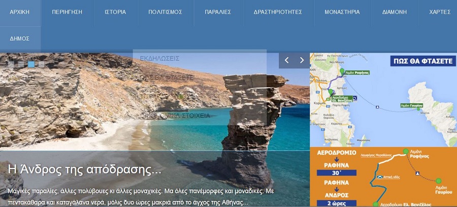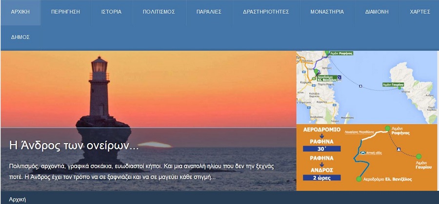 Ολοκληρώθηκε και από σήμερα, 15 Ιουνίου, είναι διαθέσιμη σε όποιον επιθυμεί να την επισκεφθεί, η νέα ιστοσελίδα του Δήμου Άνδρου. Στην ηλεκτρονική διεύθυνση www.andros.gr, ο επισκέπτης μπορεί να βρει χρήσιμες πληροφορίες για το νησί, να μάθει την ιστορία του, να δει πλήθος φωτογραφιών, να μάθει για το πώς μπορεί να φτάσει στην Άνδρο, να κλείσει τα εισιτήρια μετάβασης, αλλά και να βρει δωμάτιο διαμονής.