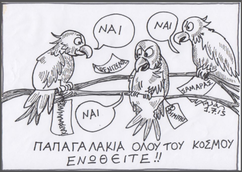 Από την άλλη η συγκέντρωση του ΝΑΙ. Μια συγκέντρωση 30.000 ανθρώπων μεγαλύτερων ηλικιών με συναισθήματα φοβικά: «θα μας διώξουν», «δεν θα μας θέλουν αν πούμε ΟΧΙ». Την ίδια στιγμή στην «ευρωπαϊκή» συγκέντρωση κυριαρχούσαν …ελληνικές σημαίες! Για να τονώσουν το φρόνημα!!!