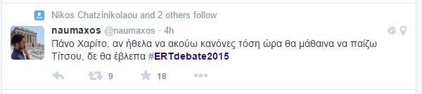 @TzortzAl :Μιλάει ο ένας, γελάει ο άλλος, κλαίμε οι υπόλοιποι. #ERTdebate2015