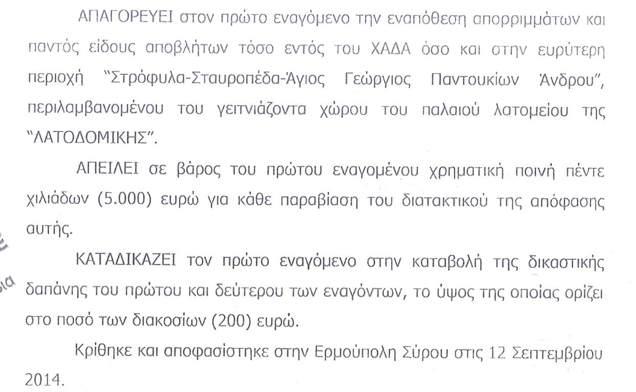 Η τελευταλία χρονολογικά απόφαση των δικαστηρίων στα οποία προσέφυγαν οι συλλόγοι κατοίκων Ζαγαριάρη-Πιτροφού όπου καταδικάζεται ο Δήμος Άνδρου.