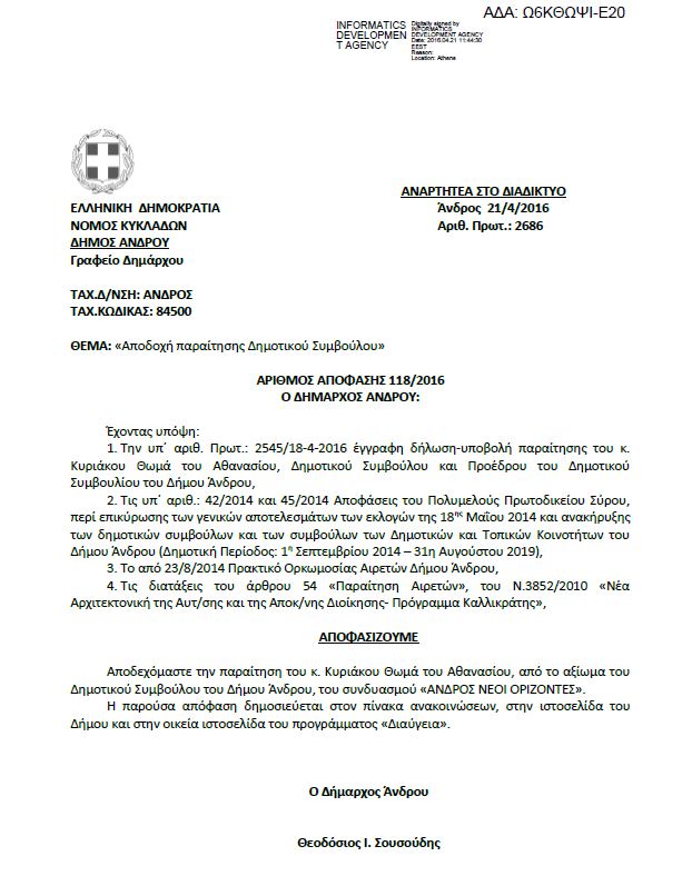 ΠΕΜΠΤΗ, 21/4/2016, ΩΡΑ 13:30 Δημοσιεύθηκε στο Διαύγεια η αποδοχή της παραίτησης του δημοτικού συμβούλου και πρώην προέδρου του δημοτικού συμβουλίου του Δήμου Άνδρου Κυριάκου Θωμά. Έπεσε έτσι λιτά η αυλαία μιας κοινής πορείας με τον Θεοδόση Σουσούδη. Μιας πορείας που ξεκίνησε πρακτικά το καλοκαίρι του 2010, είχε δύο εκλογικές αναμετρήσεις (2010 & 2014). Η πορεία αυτή ανέδειξε τον Θεοδόση Σουσούδη δήμαρχο Άνδρου. Σε όλη αυτή την πορεία ο κ. Θωμάς συνέβαλε καθοριστικά μαζί με την ομάδα του από την Υδρούσα.