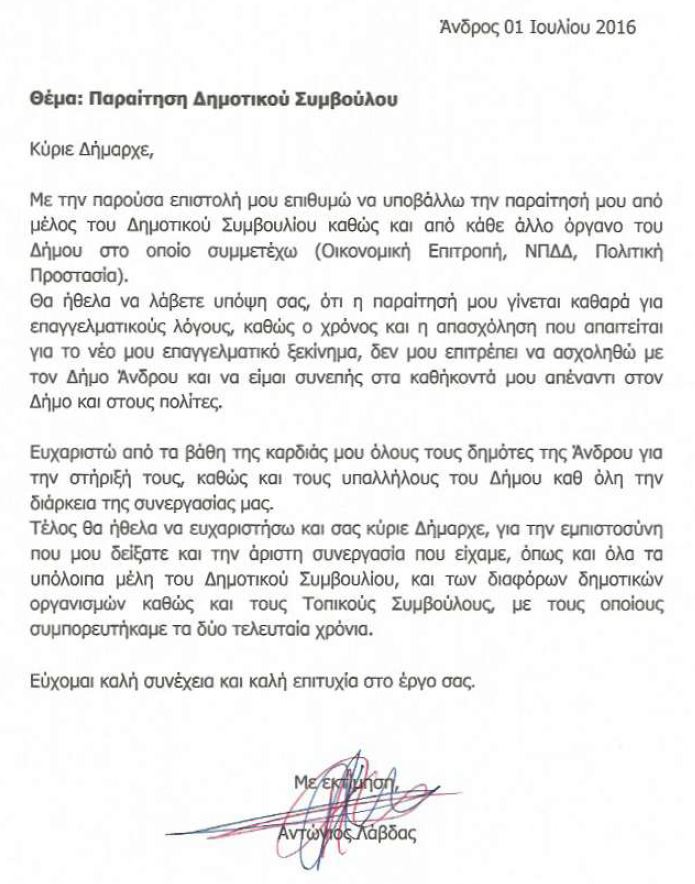 Την παραίτησή του από μέλος του Δημοτικού Συμβουλίου, καθώς και από κάθε άλλο όργανο του Δήμου Άνδρου στο οποίο μετείχε, υπέβαλλε το μεσημέρι της Παρασκευής, 1 Ιουλίου, ο Δημοτικός Σύμβουλος κ. Αντώνης Λάβδας. Όπως αναφέρει στην επιστολή του (η οποία επισυνάπτεται), η παραίτηση γίνεται για καθαρά επαγγελματικούς λόγους. Για το θέμα ο Δήμαρχος Άνδρου, Θεοδόσης Σουσούδης, έκανε την ακόλουθη δήλωση: