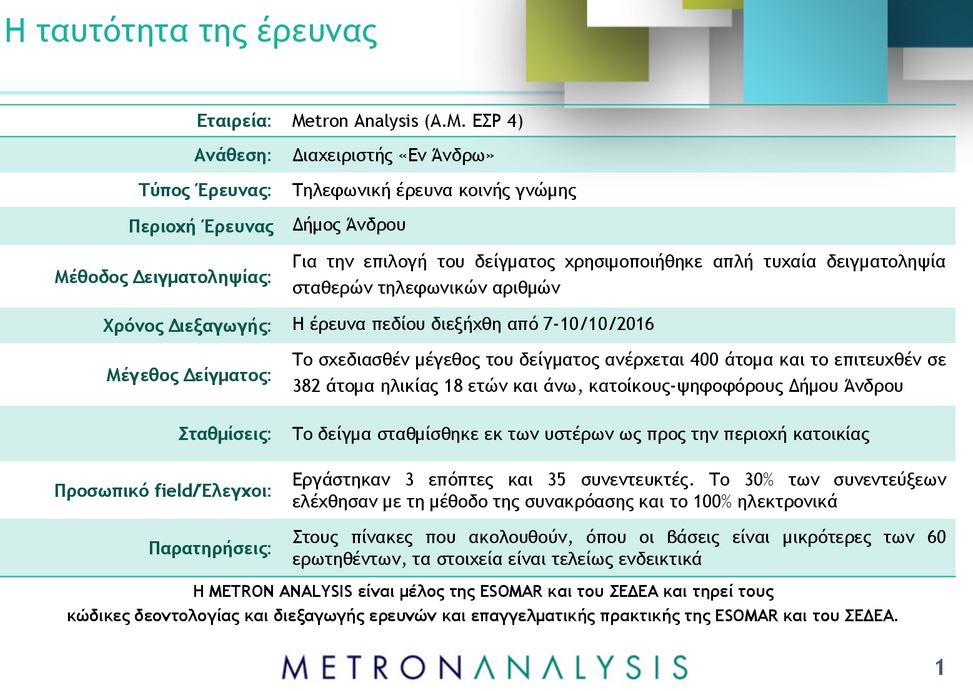 Στο ισοζύγιο θετικών και αρνητικών γνωμών περνά μπροστά κατα πολύ ο έπαρχος Άνδρου. Εδώ ο δήμαρχος έχει χάσει πολύ έδαφος από τον Απρίλιο του 2014 όταν είχε 66% θετικό ισοζύγιο, ενώ σήμερα έχει περιοριστεί στο 29% Κάτι που πρέπει να ληφθεί σοβαρά υπόψη στην ανάλυση.