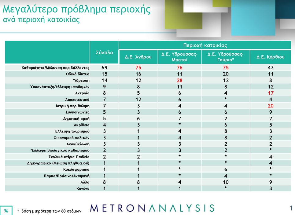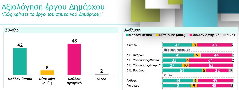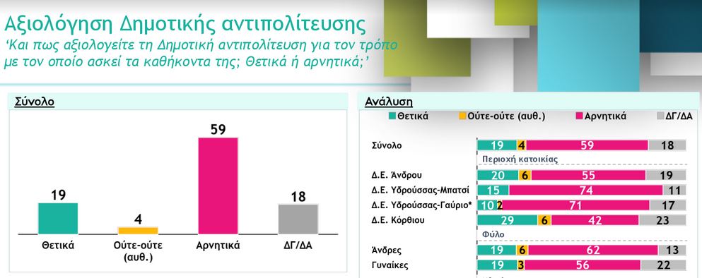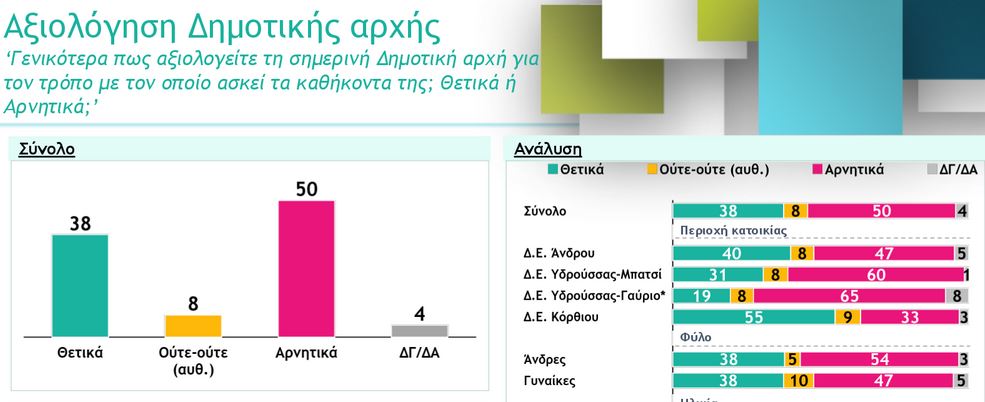Η συνολική θετική αξιολόγηση σε όλη την Άνδρο της Δημοτικής αρχής είναι στο 38% και η αρνητική στο 50%! Σημειώνουμε ότι ειδικά στην ευρύτερη περιοχή της Υδρούσσας, οι επιδόσεις της Δημοτικής αρχής είναι ιδιαίτερα επιβαρυμένες αφού στην περιοχή του Γαυρίου το 65% εκφράζεται αρνητικά στην περιοχή του Μπατσίου το 60% επίσης. Αλλά και στην Χώρα πλειοψηφούν οι αρνητικές γνώμες με 47% έναντι 40% των θετικών. Μόνο στο Κόρθι υπάρχει μια σαφώς θετική πλειοψηφία (+55% έναντι -33%), γιατί λόγω μικρού πληθυσμιακού μεγέθους της περιοχής χειμώνα-καλοκαίρι τα σκουπίδια δεν την βαραίνουν ιδιαίτερα. Όμως και το Κόρθι ακριβώς λόγω του μικρότερου πληθυσμού η πλειοψηφία του δεν βαραίνει ιδιαίτερα στο συνολικό ποσοστό του νησιού.