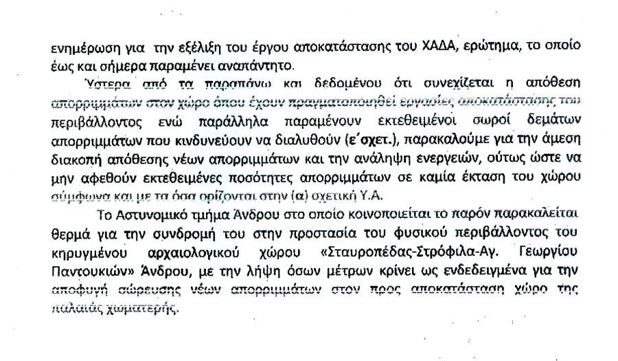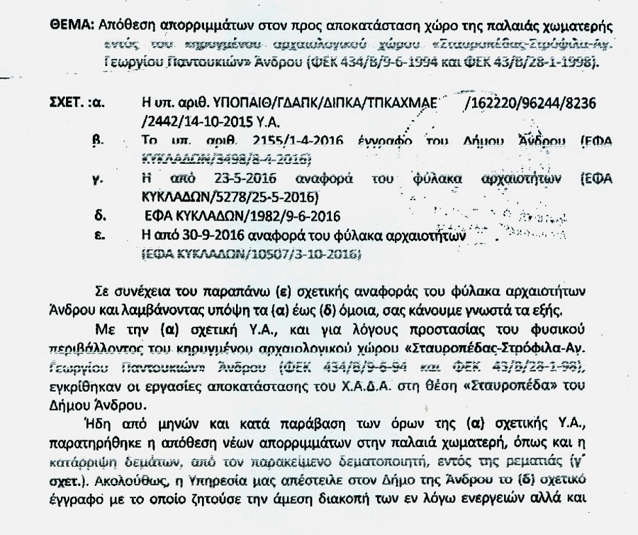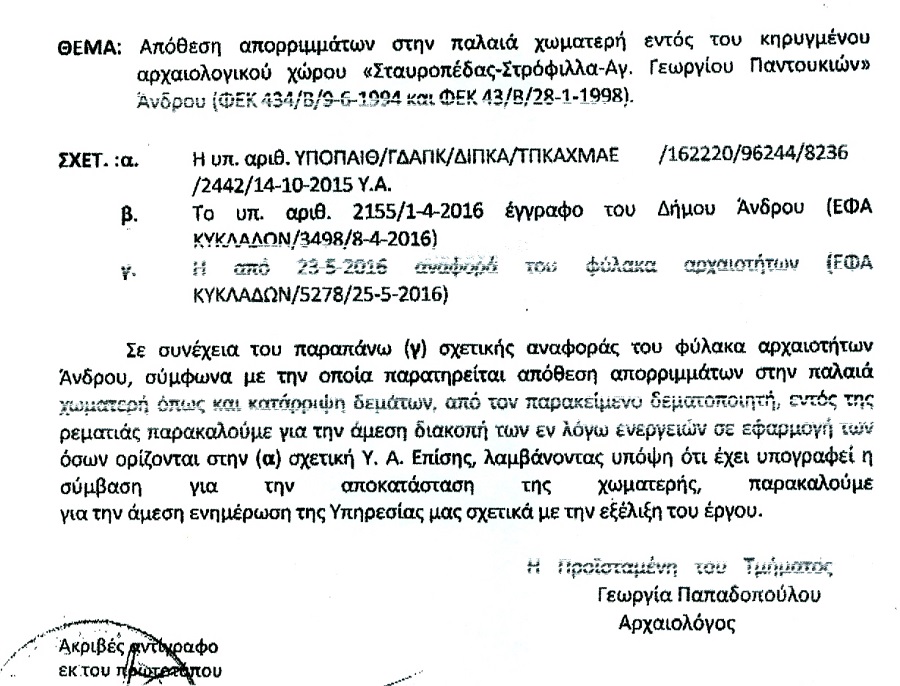 Αποκαλύπτουμε δύο επίσημα έγγραφα-φωτιά της Εφορείας Αρχαιοτήτων Κυκλάδων. Το ένα με ημερομηνία 24/6/2016 και το άλλο 20/10/2016. Το θέμα κοινό και σστα δύο: «Απόθεση απορριμμάτων στην παλαιά χωματερή στον αρχαιολογικό χώρο Σταυροπέδας – Στρόφιλα». Και τα δύο κοινοποιούνται: στην Κεντρική Υπηρεσία του ΥΠΠΟ, στον εισαγγελέα πρωτοδικών Σύρου, στο αστυνομικό τμήμα Άνδρου και στον φύλακα αρχαιοτήτων Άνδρου...