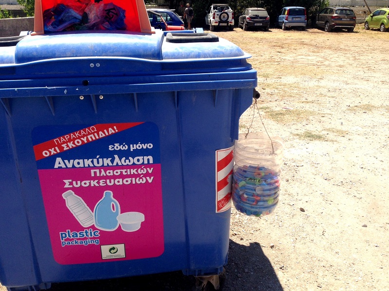 Νήσος Πάτμος: κάδος ανακύκλωσης πλαστικών με σάκο στο πλάι για τα καπάκια πλαστικών μπουκαλιών!!!