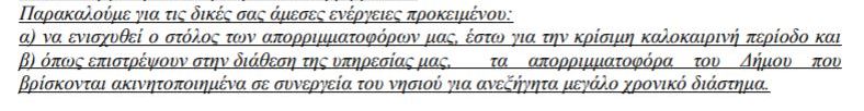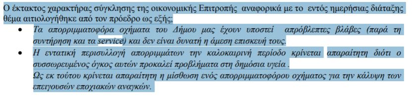 Και διαπιστώνουν ότι «τα απορριμματοφόρα του Δήμου μας έχουν υποστεί απρόβλεπτες βλάβες» (!!!) «παρά τη συντήρηση και τα service δεν είναι δυνατή η άμεση επισκευή τους»!!! Επίσης, διαπιστώνουν πως «η εντατική περισυλλογή την καλοκαιρινή περίοδο κρίνεται απαραίτητη διότι ο συσσωρευμένος όγκος  αυτών προκαλεί προβλήματα στη δημόσια υγεία»!!! Διαβάστε μόνοι σας τι γράφουν...