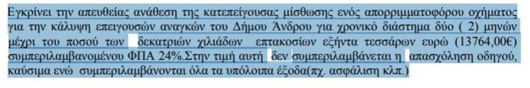 Σκηνή πρώτη: Στις 28 Ιουλίου 2017 και ενώ ήδη έχει ξεκινήσει η φουλ-σεζόν της Άνδρου συνέρχεται επειγόντως η οικονομική επιτροπή του Δήμου Άνδρου με θέμα: «Μίσθωση απορριμματοφόρου οχήματος για την κάλυψη επειγουσών εποχιακών αναγκών…». Διαβάζουμε στο Διαύγεια: