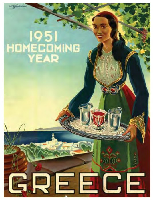 Οι ξένοι περιηγητές όμως "ανακάλυψαν" και τον ελληνικό λαϊκό πολιτισμό. Και τον περιέγραψαν στα βιβλία τους ή τον σκίτσαραν ή ακόμα και τον φωτογράφισαν. Έτσι όταν ο ελληνικός οργανισμός τουρισμού ξεκίνησε την προσάθεια προσέλκυσης τουριστών το έκανε μέσα από γνωστές ήδη φολκορικέςς εικόνες όπως βλέπουμε εδώ σε τουριστική αφίσα του 1950 που "μιλά" για το ερχόμενο έτος... το 1951.