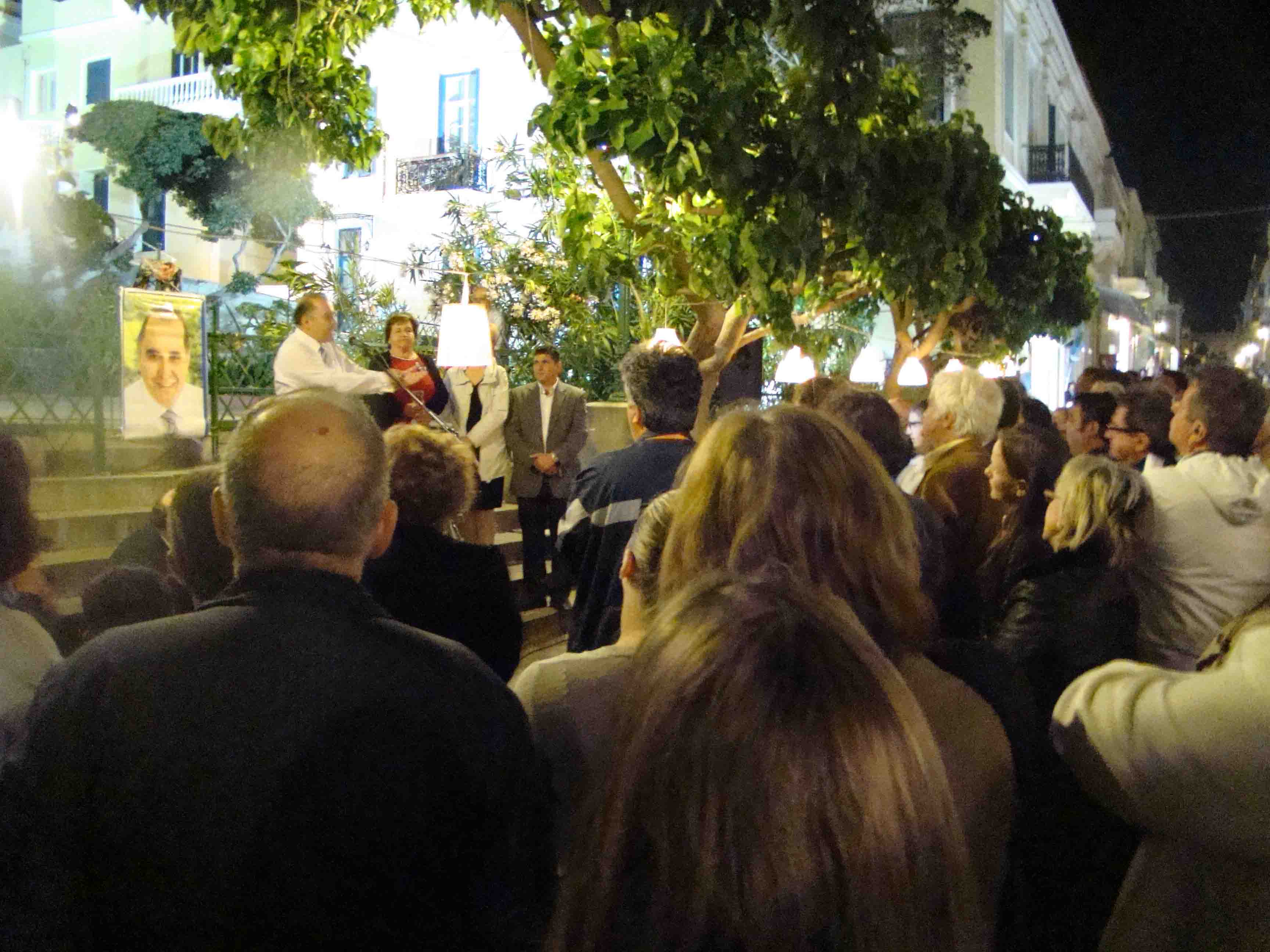 Και του κ. Μαλταμπέ ο σχεδιασμός (έστω την τελευταία στιγμή) πέτυχε. Κόσμος σχετικά λίγος. Αλλά και οι σχετικοί περίεργοι (ανάμεσα τους κι εγώ για να μην λέτε), που πήγαμε αφού τέλειωσε η ομιλία Σουσούδη. Όλοι μαζί είμαστε καμιά 150νταριά! Λίγο στριμωγμένοι είναι αλήθεια γιατί και ο πεζόδρομος μικρός και στενάχωρος. Αλλά όλοι οι γνωστοί χωράνε…