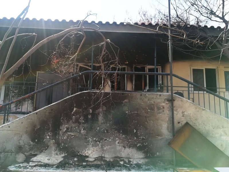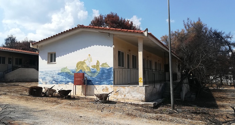 Η κοινότητα "δελφίνια" των παιδικών εξοχών του Οίκου Ναύτου ανάμεσα στα καμένα πεύκα και στην μισοκαμένη κοινότητα πίσω της. Κάτι από τις παιδικές μνήμες διασώθηκε να θυμίζει πως εδώ κάποτε υπήρξε κατι από την ζωή των παιδιών των ναυτικών (φωτ. Εν Άνδρω).
